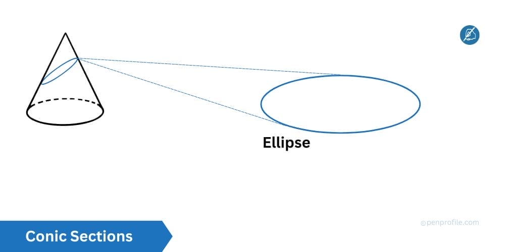 An ellipse is another conic section which is formed from intersecting a plane with a cone at a specific angle such that the plane is not intersecting the base of the cone. It is the set of all points in a plance upon where the sum of the distances from any two fixed points, also known as the foci, is constant.